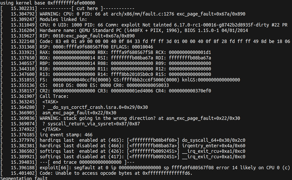 And after KPTI enabled, we can still leak debug print from WARN_ON_ONCE when we returned to usermode and accessing address 0 and trigger the page fault.