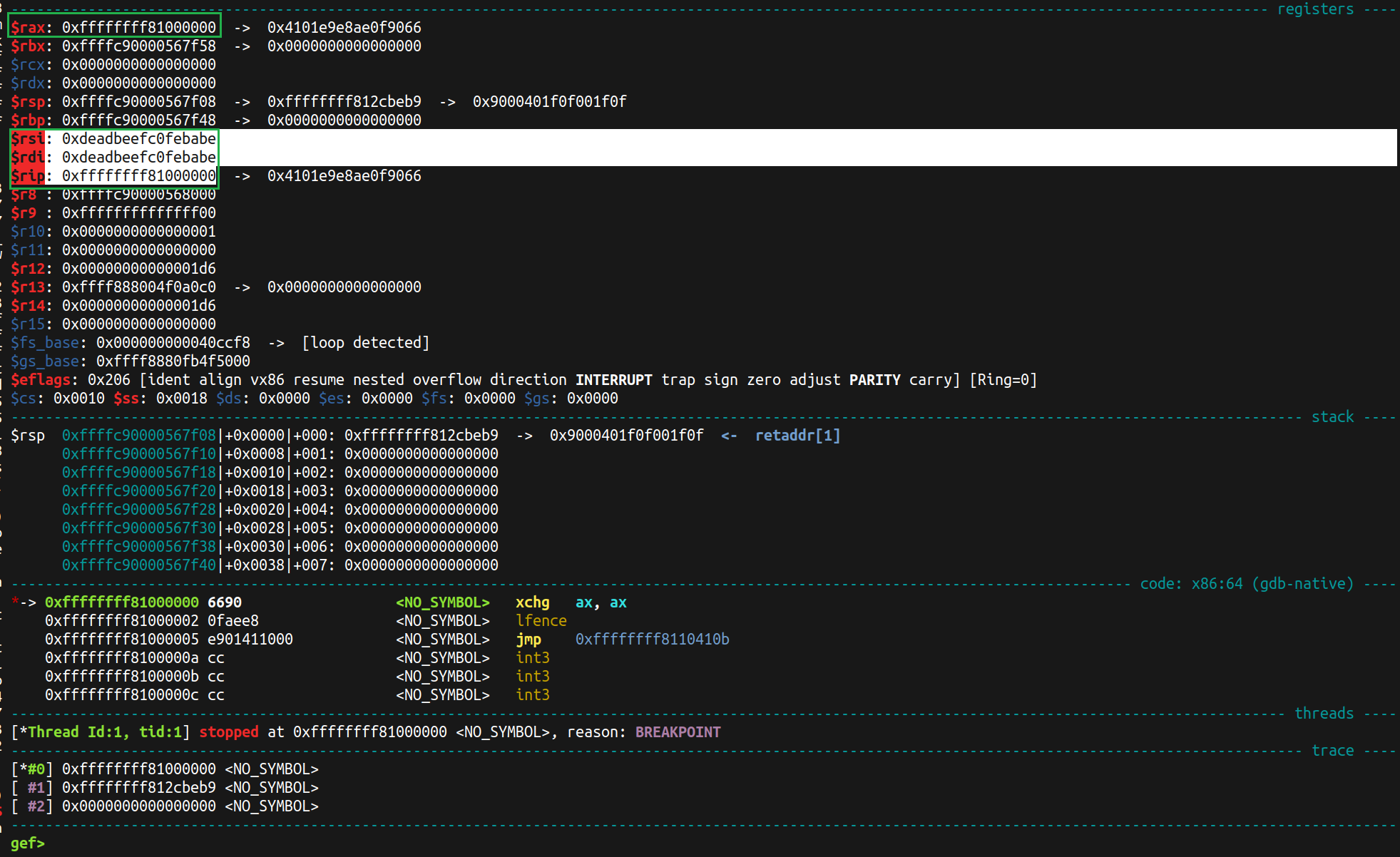 When page fault happens, if eflags (which is set to be 1 from R11 when sysret happens) is not 0, a WARN_ON_ONCE in page fault handler will be triggered and give us debug print with kernel heap addresses on regular registers and GS register.